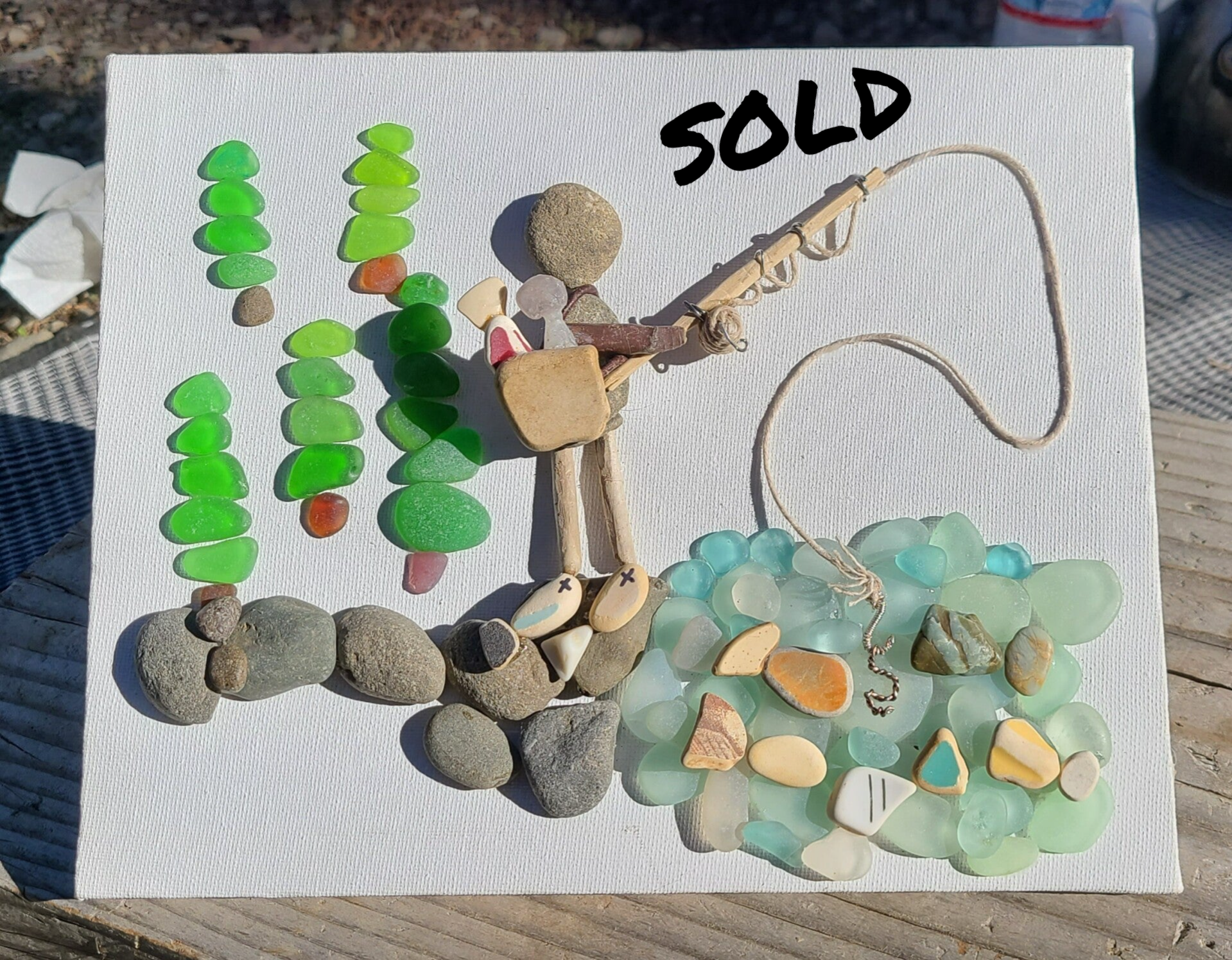 8*10 canvas rock art. fishing fun made with sea glass, made with sea glass and rocks from the west coast, Pacific Ocean.